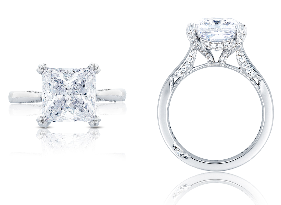TACORI is one of today’s top designers in the engagement ring and fashion jewelry world. Combining this fact with that one of today’s ever-popular diamond shapes is the intricately cut princess shape, it is easy to find an engagement ring any fiancé to be will love. When you are looking for an engagement ring for your future bride, consider looking into an engagement ring crafted by well-known designer TACORI, and go with a band that fits the stunning princess cut. Here we will look at five princess cut engagement rings from TACORI that will surely have her saying yes!
